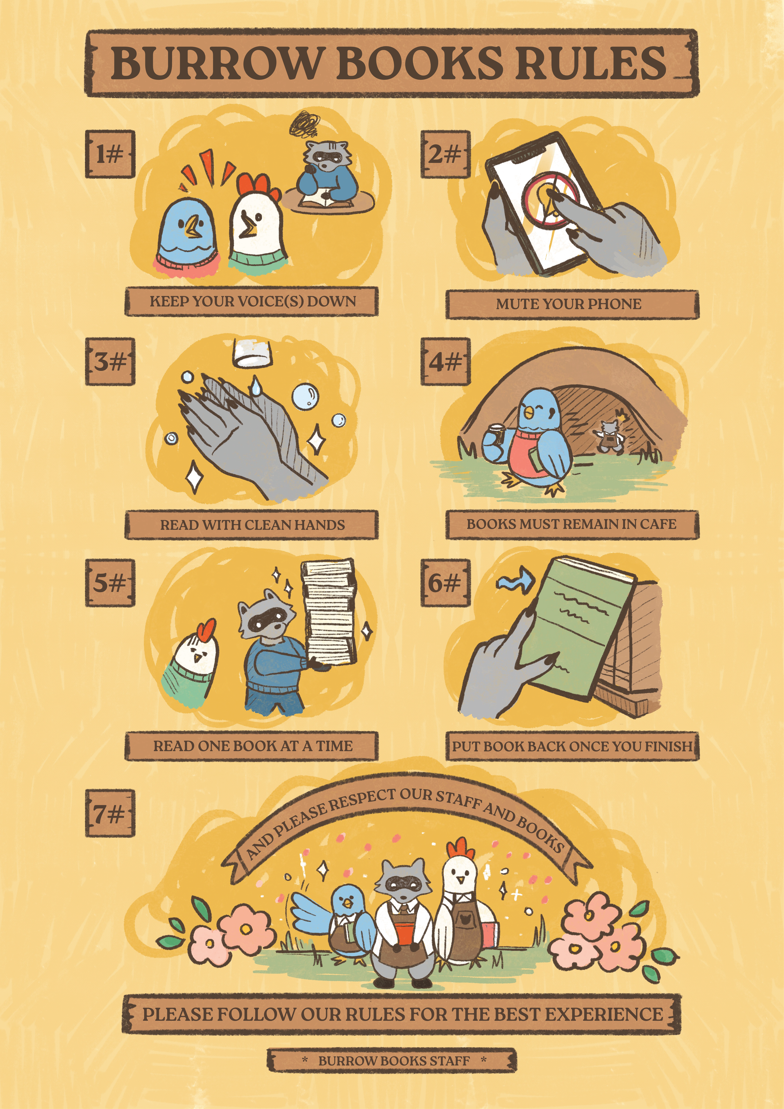 These are the rules for customers to follow before entering the store to ensure they show respect to the staff, to each other, and to the books they borrow.
