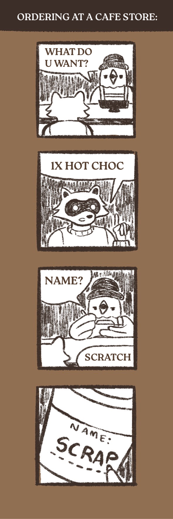 These posters are placed throughout the space and are available for purchase, reinforcing the café’s creative and playful vibe centered around its mascot, Scratch.